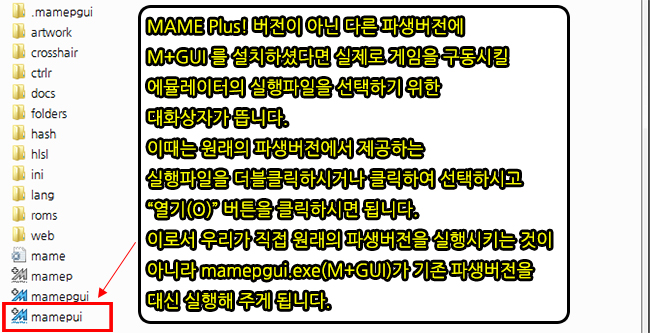 버전의 에뮬레이터에 설치하셨다면 최초 실행시 mamep.exe를 찾이 못해 실행파일을 선택하라는 메세지가 나옵니다. 파생버전