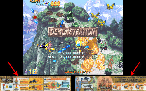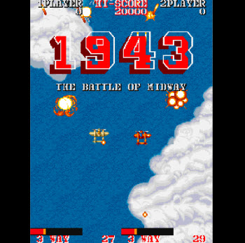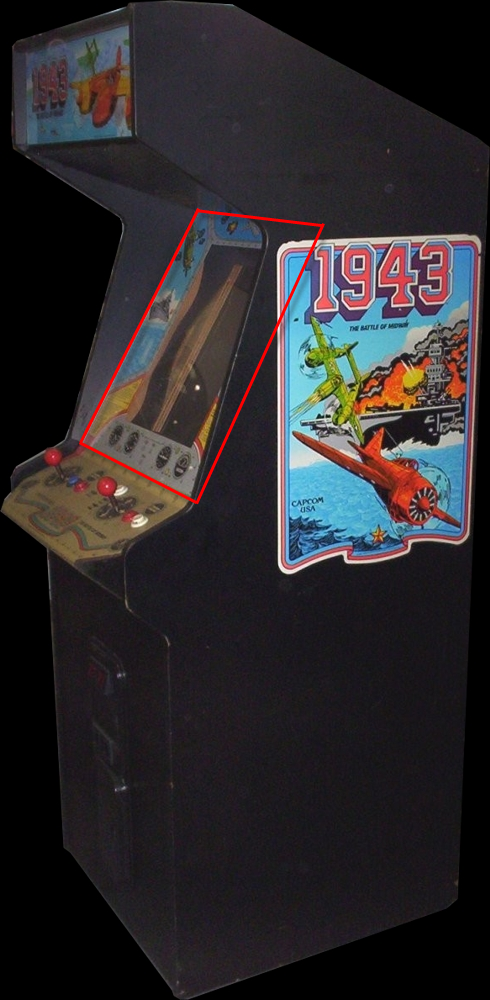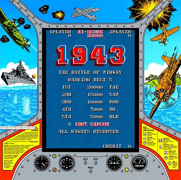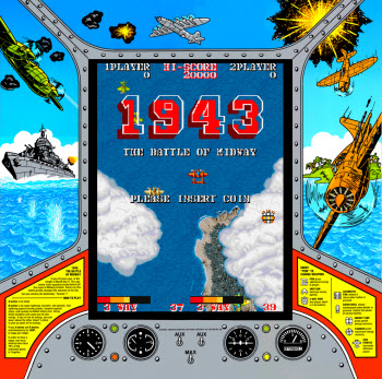 - 아래는 1943 (Capcom - 1987년작)의 업소에서 구동되던 실제기기의 모습입니다. 비교적 90년대 이전 게임에서 아트웍을