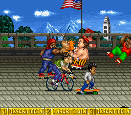 A side scrolling beat'em up. 3 characters, one on a skateboard, one on a bike and one on rollerskates fight