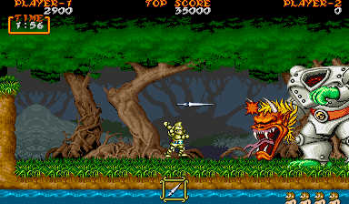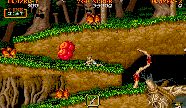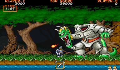 which gives Arthur greater protection from the demons. Additionally, unlike "Ghosts'n Goblins", Arthur can now
