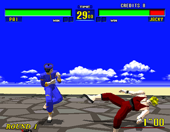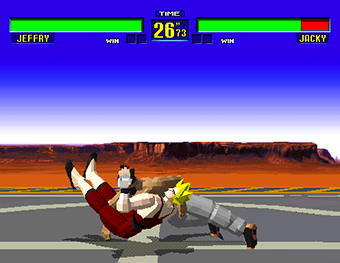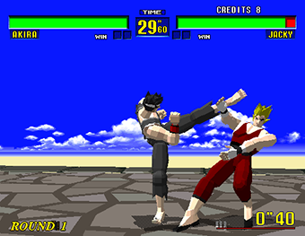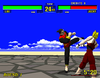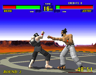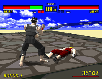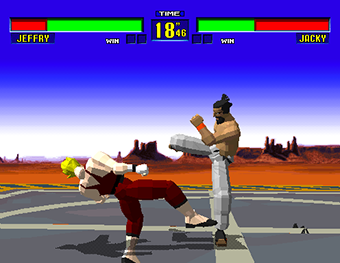 Virtua Fighter serves 180,000 polygons per second. This is the first 3-D polygonal one-on-one fighting game.