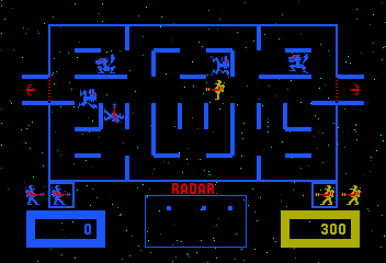 The Wizard of Wor teleports randomly about the maze shooting off lightening bolts.