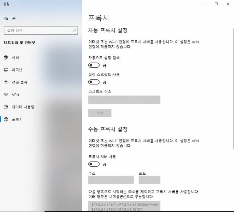 설정 - 검색 - 자동 프록시 설정 - 자동으로 설정 검색 - 끔으로 변경
