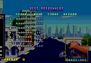 - TECHNICAL - Game ID : 317-0118 Main CPU : (2x) 68000 (@ 12.5 Mhz) Sound CPU : Z80 (@ 4 Mhz) Sound Chips : YM2151 (@ 4 Mhz), Sega (@ 4 Mhz) Screen orientation : Horizontal Video resolution : 320 x 224 pixels Screen refresh : 60.00 Hz Palette colors : 12288 Players : 1 Control : steering wheel Buttons : 2