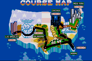 Turbo Out-Run's sixteen stages are as follows: * Stage 1: New York * Stage 2: Washington D.C. * Stage 3: Pittsburgh * Stage 4: Indianapolis (1st car upgrade section) * Stage 5: Chicago * Stage 6: St. Louis * Stage 7: Memphis * Stage 8: Atlanta (2nd car upgrade section) * Stage 9: Miami * Stage 10: New Orleans * Stage 11: San Antonio * Stage 12: Dallas (3rd car upgrade section) * Stage 13: Oklahoma City * Stage 14: Denver * Stage 15: Grand Canyon (Runs along Route 66) * Stage 16: Los Angeles (End of game)