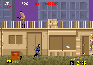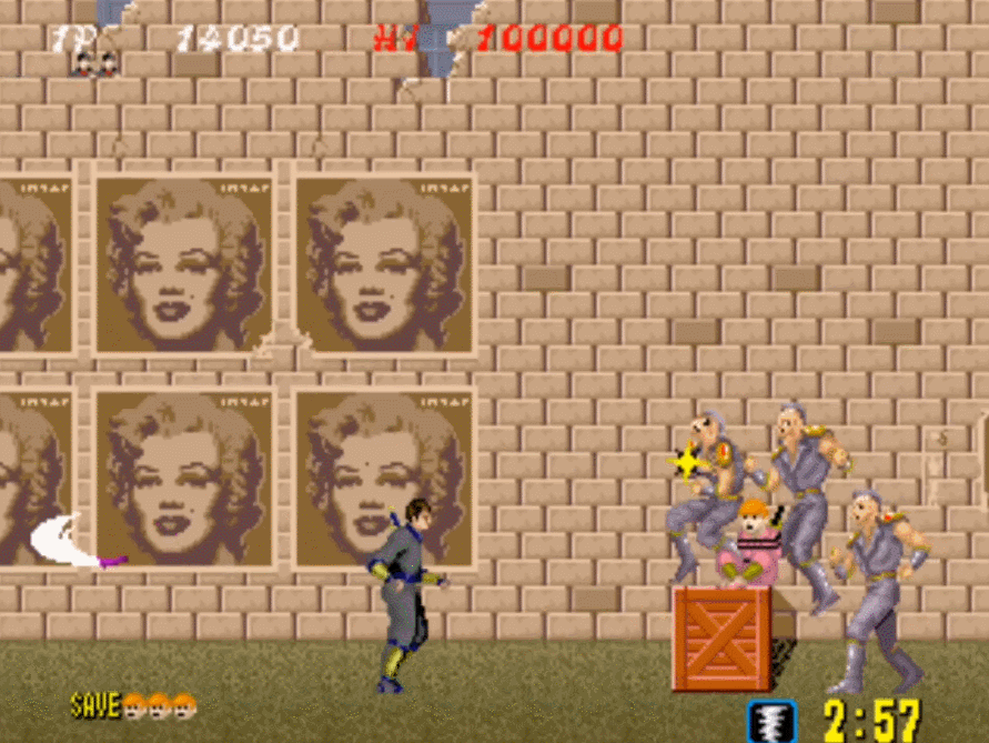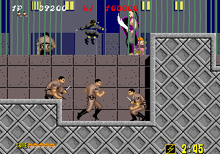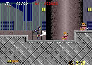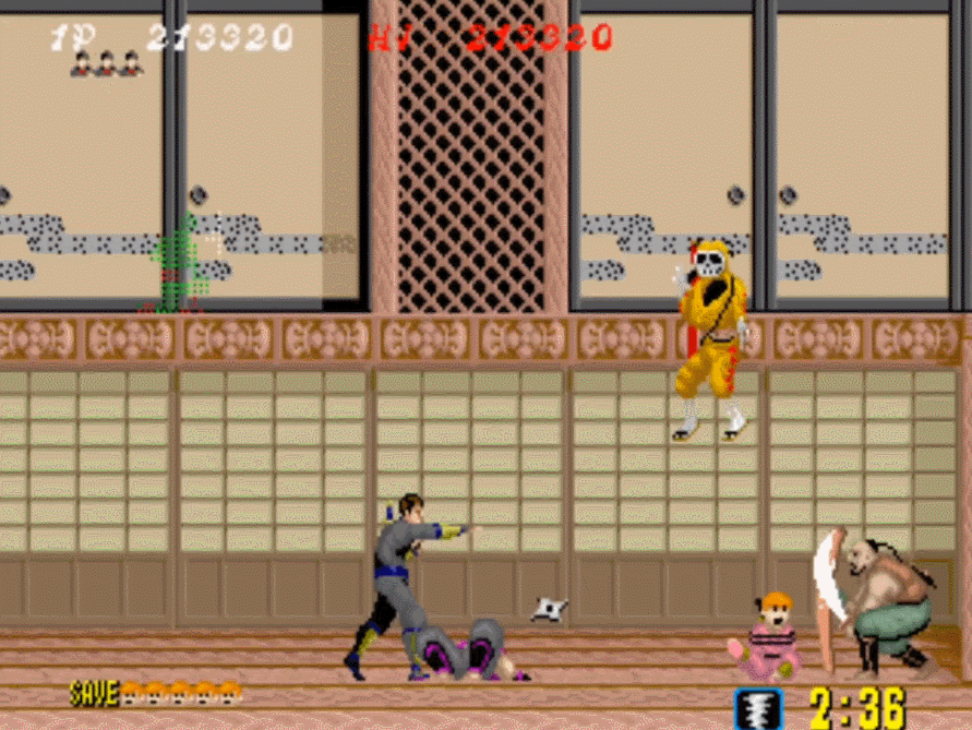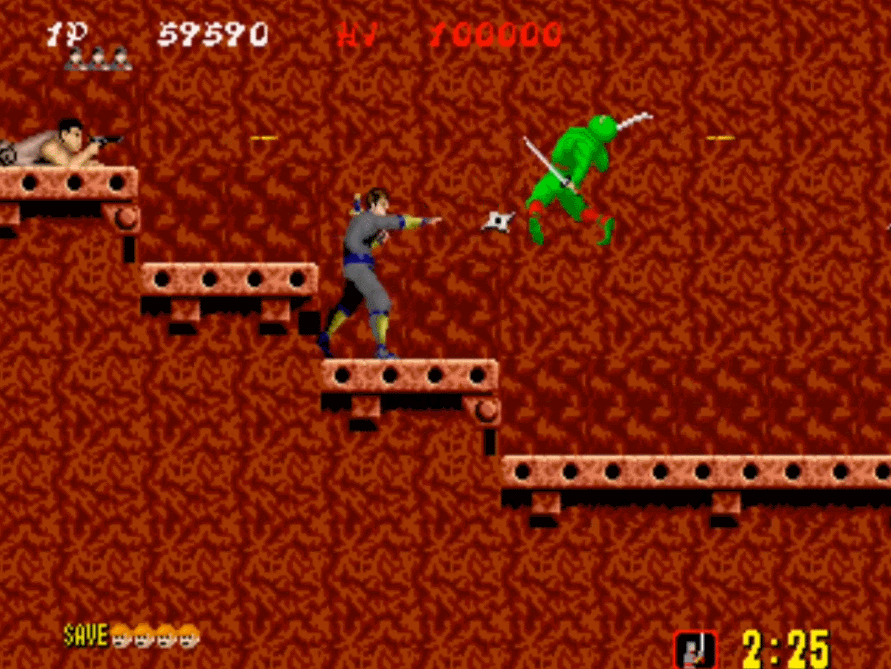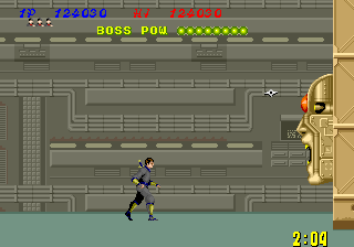 A scrolling platform beat-em-up in which the player takes on the role of Joe Musashi, a Ninja, who must fight